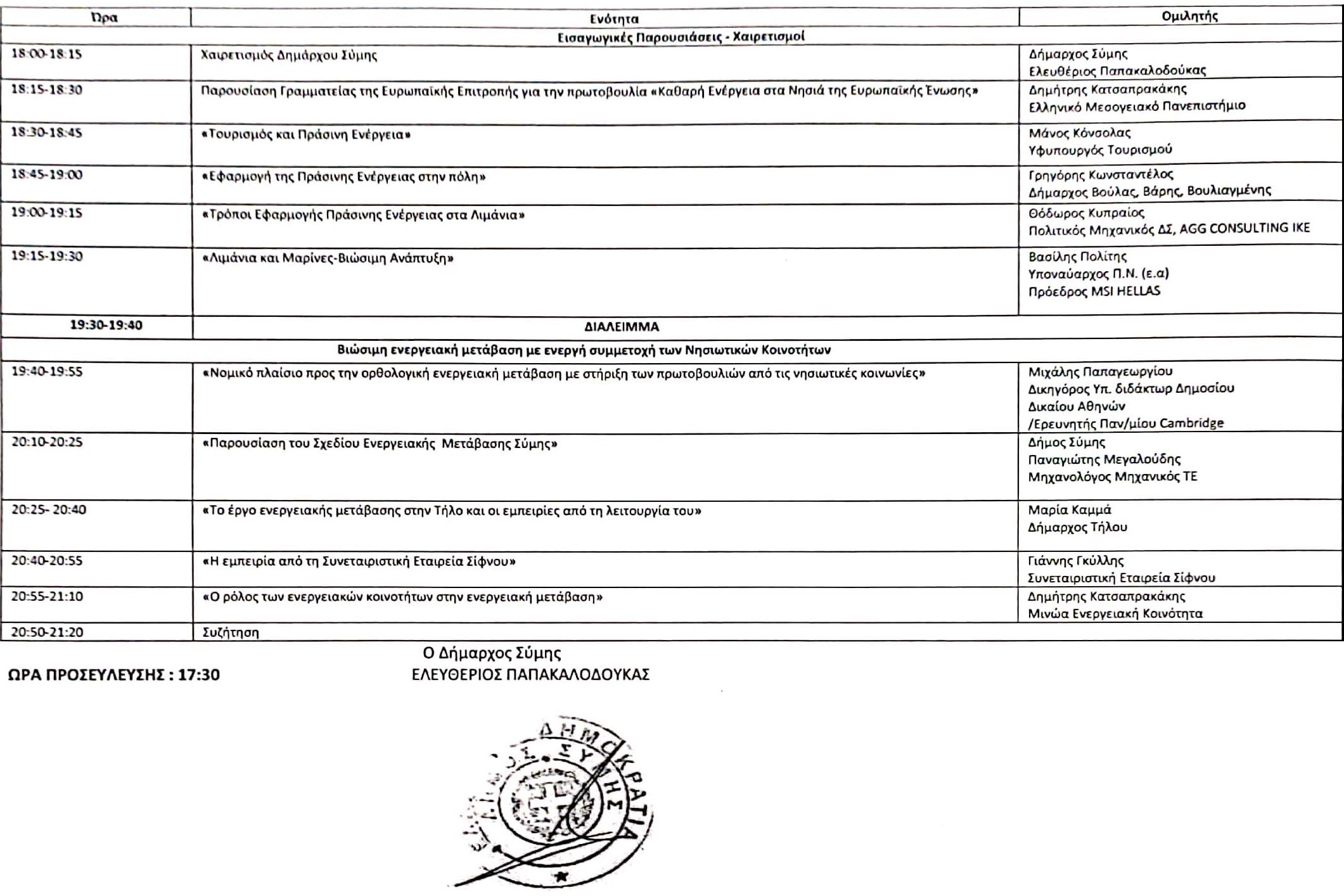 Ο Δήμος Σύμης στο πλαίσιο των αρμοδιοτήτων του και προκειμένου να συμβάλει στην ανάπτυξη των δράσεων για την ενεργειακή μετάβαση της Σύμης προς τις καθαρές και ανανεώσιμες πηγές ενέργειας με την ενεργή και ρυθμιστική συμμετοχή της Κοινωνίας της Σύμης, αποφάσισε τη διεξαγωγή ημερίδας για την ενημέρωση όλων των κατοίκων του νησιού, υπό την αιγίδα και την υποστήριξη – σε οργανωτικό και οικονομικό επίπεδο – της Γραμματείας της Ευρωπαϊκής Επιτροπής για την πρωτοβουλία «Καθαρή ενέργεια για τα νησιά της Ευρωπαϊκής Ένωσης».