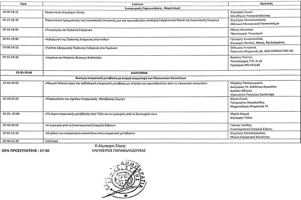 Θέμα: Διεξαγωγή ημερίδας για την Καθαρή Ενέργεια στη Σύμη