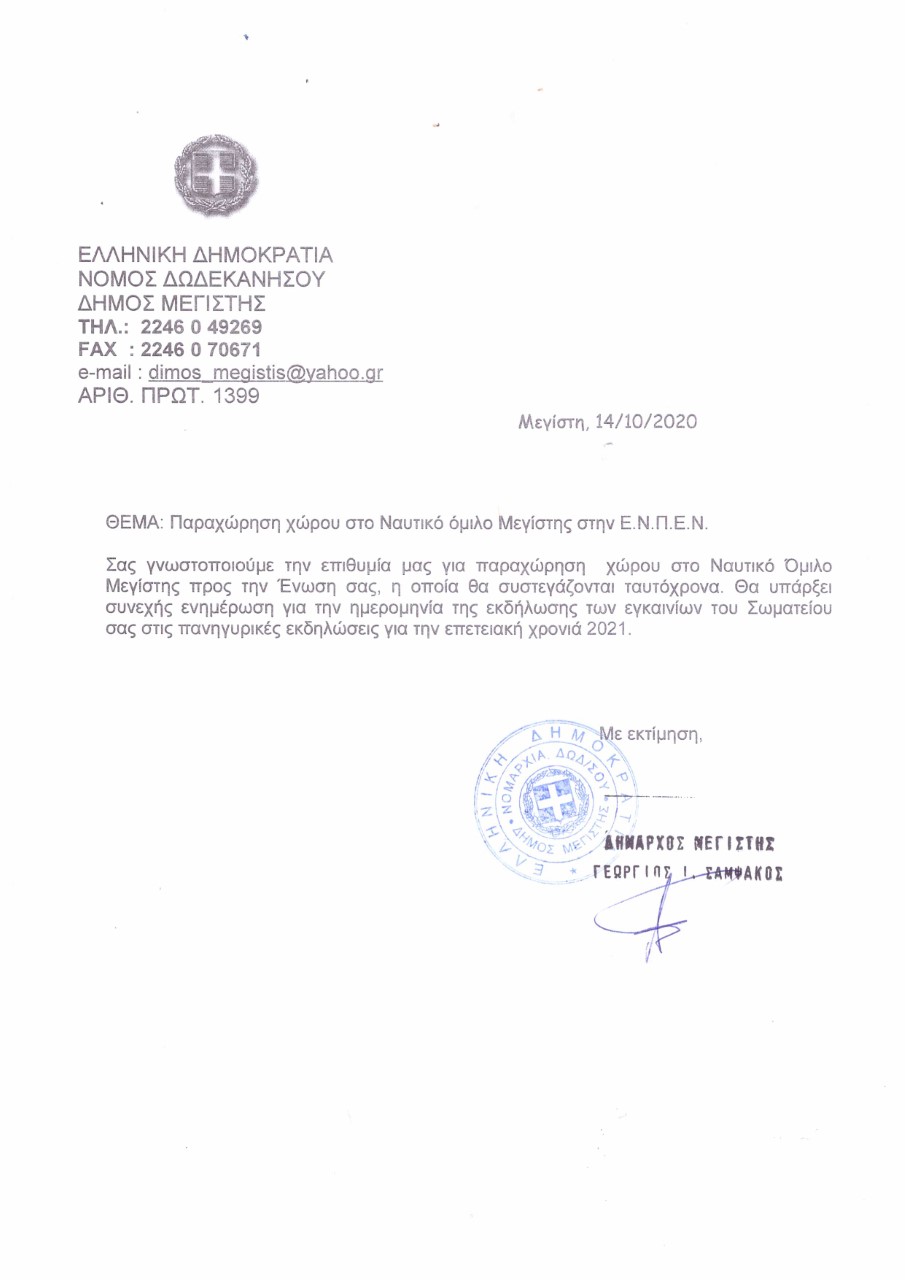 Επικαιρότητα Ευχαριστούμε θερμά τον Δήμαρχο Μεγίστης κ.Σαμσάκο και όλο το διοικητικό συμβούλιο για την ενέργεια τους να μας εντάξουν στην «οικογένεια τους», παραχωρώντας μας τον χώρο για τη στέγαση της έδρας της ΕΝΠΕΝ στο ακριτικό νησί τους. Date: 16/10/2020Author: ΕΝΠΕΝ Αριθμός Πρωτοκόλλου 1399 Λήψη Μου αρέσει! Φόρτωση... Σχετικά