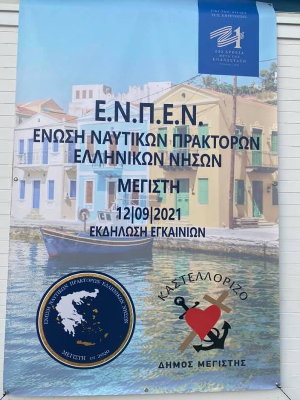 Την 12-09-2021 στη νήσο Μεγίστη (Καστελλόριζο), που αποτελεί και την έδρα της Ένωσής μας, τελέστηκαν τα εγκαίνια των γραφείων μας υπό την Aιγίδα της Επιτροπής «Ελλάδα 2021» και την αρωγή του Δήμου Μεγίστης. Τον αγιασμό τέλεσε ο Σεβασμιότατος Μητροπολίτης Σύμης, Χάλκης, Τήλου και Καστελλορίζου κ. Χρυσόστομος, ενώ τίμησαν με την παρουσία τους και απηύθυναν χαιρετισμό ο χωρικός Αντιπεριφερειάρχης Δωδεκανήσου κ. Χρήστος Ευστρατίου, ο Αντιδήμαρχος Μεγίστης κ. Ευστράτιος Αμύγδαλος, ο Δήμαρχος Σύμης κ. Ελευθέριος Παπακαλοδούκας και ο πρώην Υπουργός κ. Αριστοτέλης Παυλίδης. Παρέστησαν επίσης ο Δήμαρχος Μεγίστης κ. Γεώργιος Σαμψάκος, ο Αρχιπλοίαρχος Λ.Σ. Παντελής Χαμέτης Διοικητής 8ης ΠΕ.ΔΙ.Λ.Σ., ο Διοικητής της ΔΑΝ/ Μεγίστης Συνταγματάρχης Αθανάσιος Φωτεινόγλου, ο Επίτιμος Πρόεδρος της Ε.Ν.Π.Ε.Ν. κ. Αθανάσιος Πέτρου καθώς μέλη της Ένωσής μας από Πάτμο, Ρόδο, Μύκονο κλπ. καθώς και καλεσμένοι του Σωματείου μας. Επίσης αναγνώστηκαν οι χαιρετισμοί της Προέδρος της Επιτροπής «Ελλάδα 2021» κυρίας Γιάννας Αγγελοπούλου-Δασκαλάκη και του Προέδρου της Ομοσπονδίας Ναυτικών Πρακτόρων Ελλάδας κ. Βασιλείου Καμπάκη. Όλοι επιδοκίμασαν ζωηρά την επιλογή της Ε.Ν.Π.Ε.Ν. να ορίσει έδρα το Καστελλόριζο και παρακίνησαν και άλλα σωματεία, ενώσεις και εταιρείες να ακολουθήσουν το παράδειγμά μας, ώστε το ακριτικό νησί μας να καταστεί επιχειρηματικό και πολιτιστικό κέντρο.